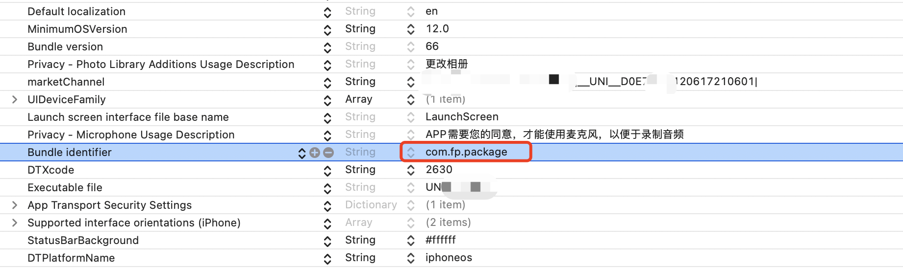 以上是manifest.json配置,其中bundleid显示配置了,我才用的是云打包,第一张截图就显示了Bundle Identifier在Info.plist中的值为com.fp.package