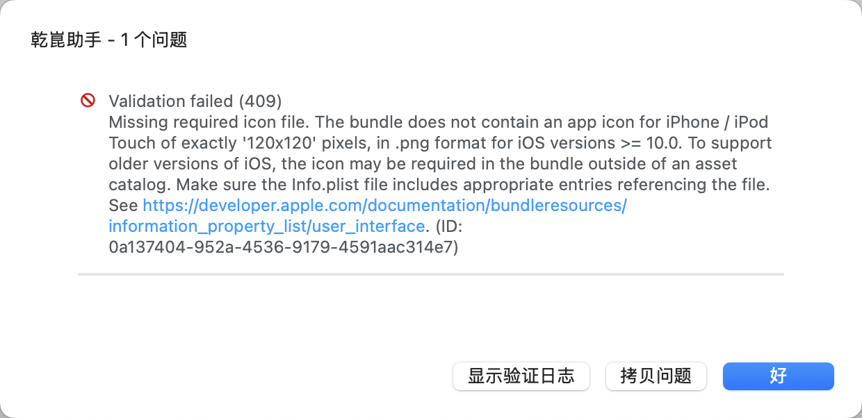 Missing required icon file. The bundle does not contain an app icon for iPhone / iPod Touch of exactly '120x120' pixels, in .png format for iOS versions >= 10.0. To support older versions of iOS, the icon may be required in the bundle outside of an asset catalog. Make sure the Info.plist file includes appropriate entries referencing the file. See https://developer.apple.com/documentation/bundleresources/information_property_list/user_interface. (ID: 0a137404-952a-4536-9179-4591aac314e7)