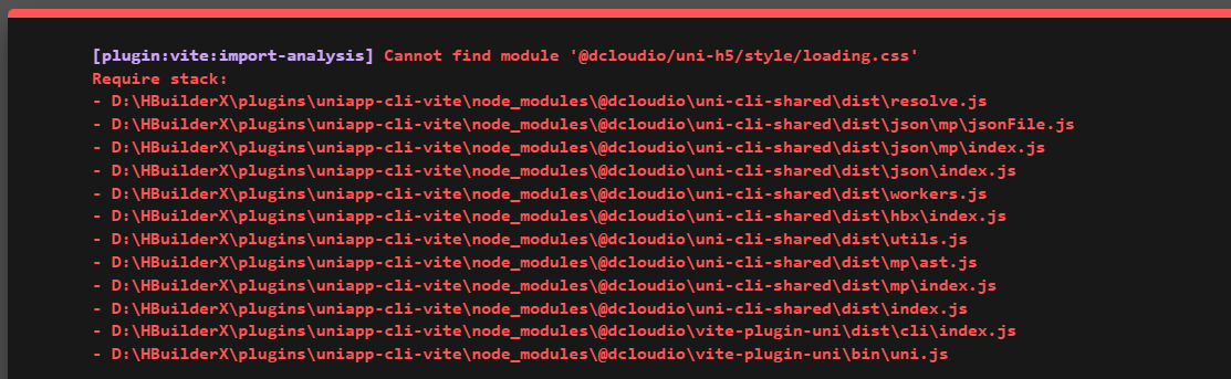 [plugin:vite:import-analysis] Cannot find module '@dcloudio/uni-h5/style/loading.cssRequire stack:D: \HBuilderX\plugins \uniapp-cli-vite\nodemodules\@dcloudio\uni-cli-shared\dist \resolve.jsD:\HBuilderX\plugins \uniapp-cli-vite\node modules(@dcloudio\uni-cli-shared\dist \json\mp\jsonFile.jsD:\HBuilderX\plugins\uniapp-cli-vite\node_ modules \@dcloudio luni-cli-shared\dist \json\mplindex.jsD:VHBuilderX\plugins\uniapp-cli-vite\node modules\@dcloudioluni-cli-shared\dist\json\index. jsD: \HBuilderX\plugins \uniapp-cli-vite\nodemodules\@dcloudio\uni-cli-shared\dist \workers.jsD: \HBuilderX\plugins \uniapp-cli-vite\node modules\@dcloudio\uni-cli-shared\dist \hbx\index. jsD: \HBuilderX\plugins \uniapp-cli-vite\node_modules\@dcloudio\uni-cli-shared\dist \utils.jsD: \HBuilderX\plugins\uniapp-cli-vite\node modules\@dcloudio\uni-cli-shared\dist \mp\ast.jsD: \HBuilderX\plugins \uniapp-cli-vite\node_modules \@dcloudio\uni-cli-shared\dist\mp\index. jsD: \HBuilderX\plugins\uniapp-cli-vite\nodemodules\@dcloudio\uni-cli-shared\dist \index.jsD: \HBuilderX\plugins\uniapp-cli-vite\node modules \@dcloudio\vite-plugin-uni\dist\cli\index. jsD: \HBuilderX\plugins\uniapp-cli-vite\node_modules\@dcloudio\vite-plugin-uni \bin\uni. js