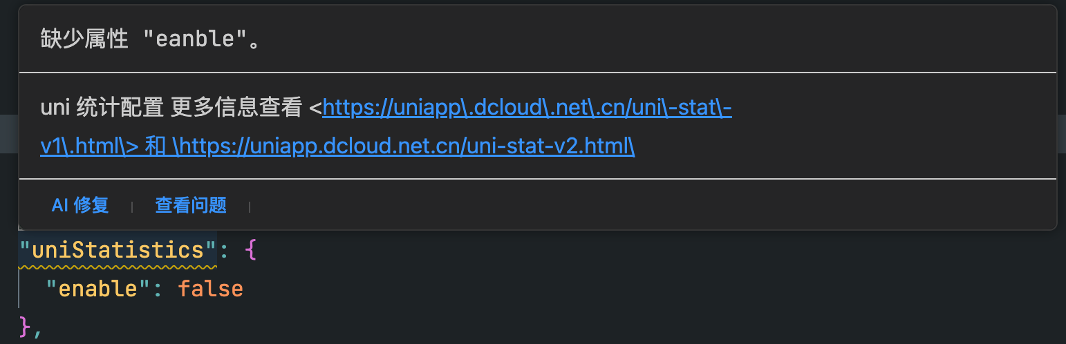 这不是用户的配置错误或概念误解,而是开发工具(VSCode uni-app插件)内部的校验规则存在拼写缺陷。用户配置的uniStatistics.enable字段完全符合uni统计配置规范和uni统计2.0前端采集配置的要求。