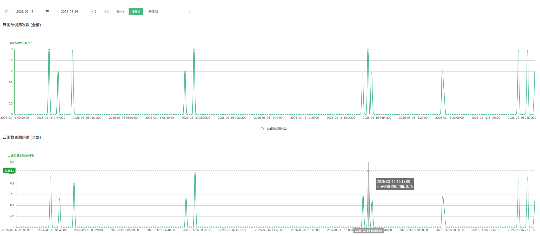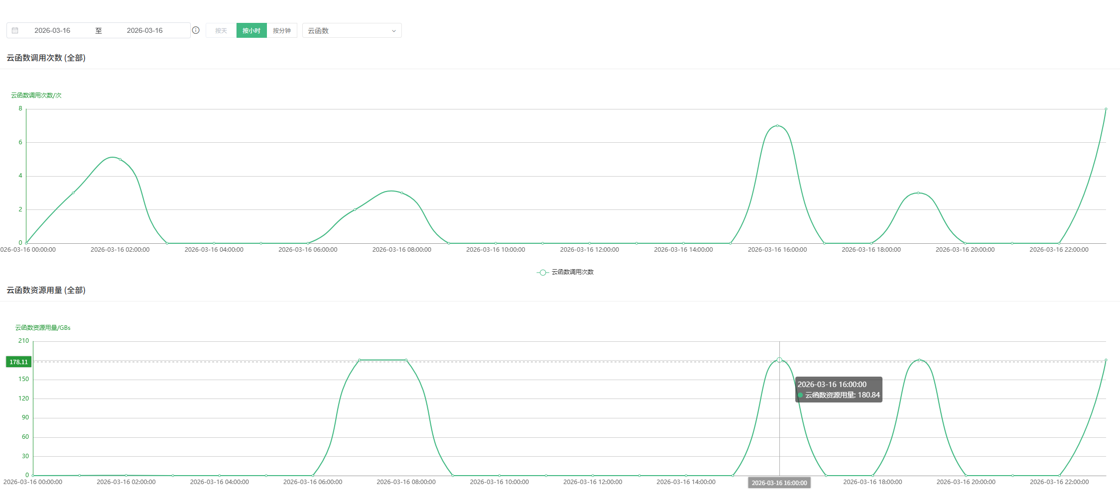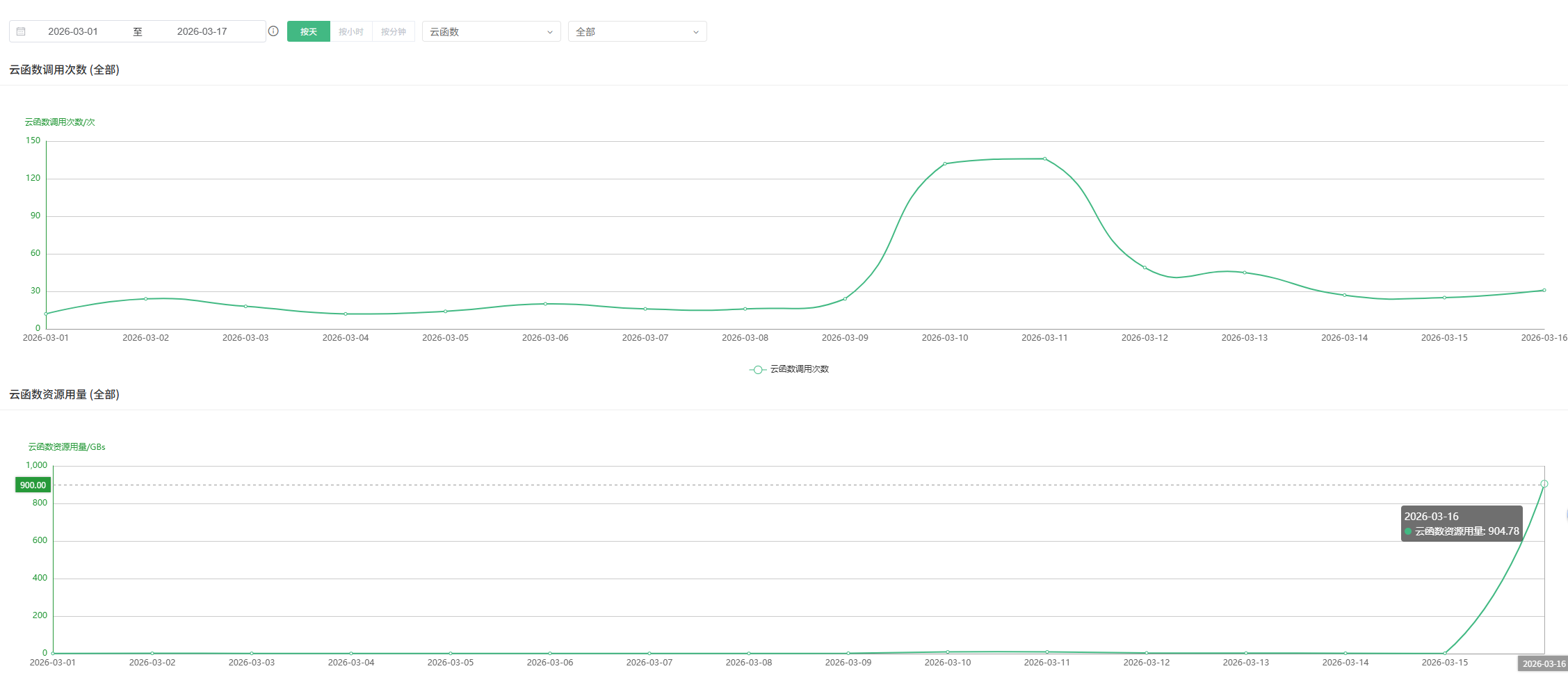 此云服务仅为调试用途,一共三四个云函数,在【云函数资源用量】图表中看到16号突然暴涨904GBs;按天查询有16号904GBs记录,按小时和分钟均没有用量达到904GBs的用量记录!