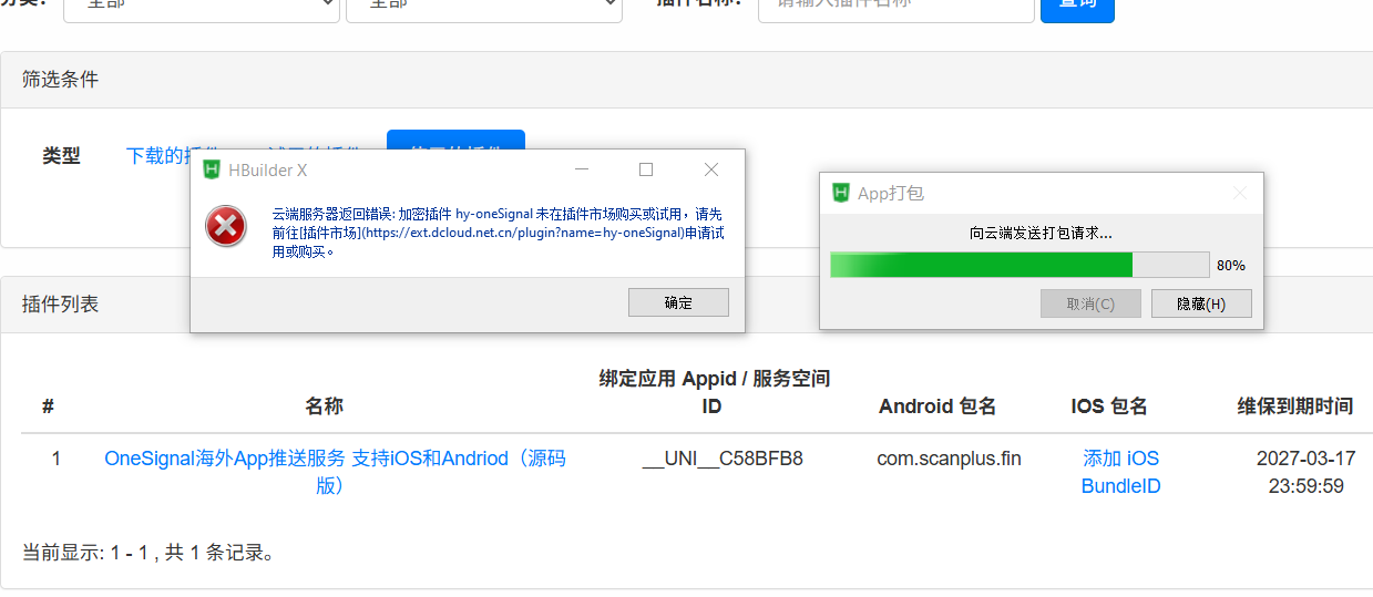 插件市场的原生插件(含付费插件)在下单时将「AppID + Android包名」一起写进了授权记录。如果打包时的 AppID 或包名与购买时绑定的不一致,云端打包校验会失败并提示"未购买"。