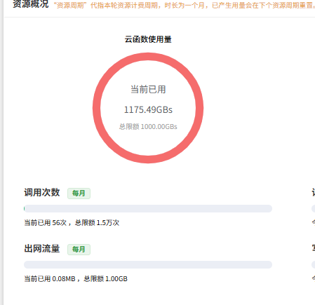 如果您的服务空间有13个不同的函数(或同一函数在13个小时内被触发),每个小时按90 GBs计算:13 × 90 = 1170 GBs,这与您看到的1175.49 GBs基本吻合。