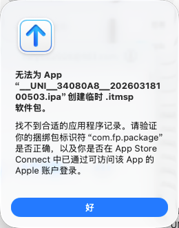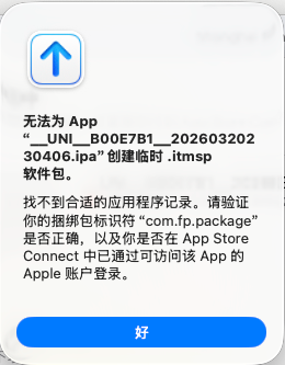 升级5.0.3以后 ios打包上传Transporter提示:找不到合适的应用程序记录。请验证你的捆绑包标识符“com.fp.package”是否正确,以及你是否在 App Store Connect 中已通过可访问该 App 的 Apple 账户登录。回退到4.87版本重新打包就可以了