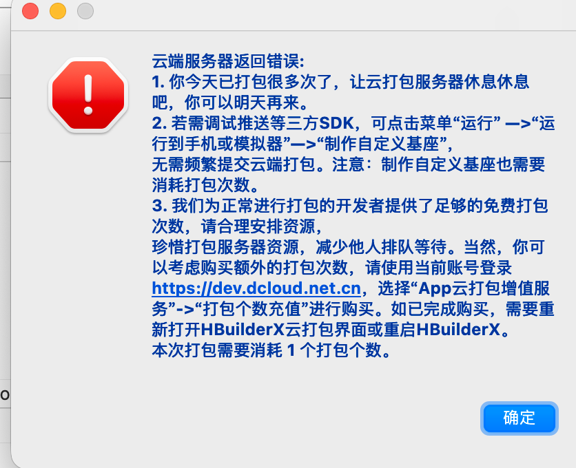 - 打包次数不足:虽然安心打包的非首次打包不占用免费次数,但如果账号的云端免费打包额度已耗尽(系统会按天、按月限制账号打包次数),首次打包或正式打包可能无法提交。可登录开发者中心在 打包个数充值 页面查看剩余额度。