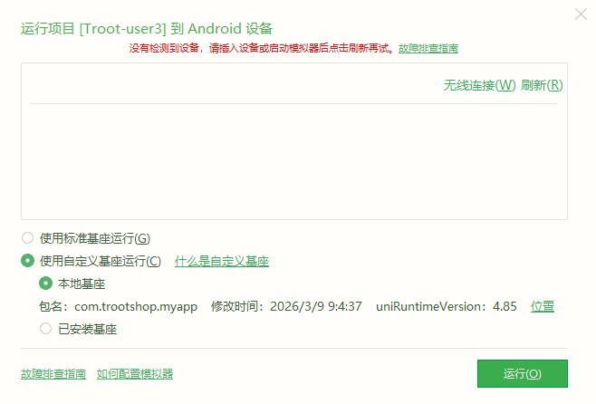 - 如遇"同步资源失败,未得到同步资源的授权"错误,可能是手机系统分身功能导致基座安装到了分身空间,需在初始空间重新运行