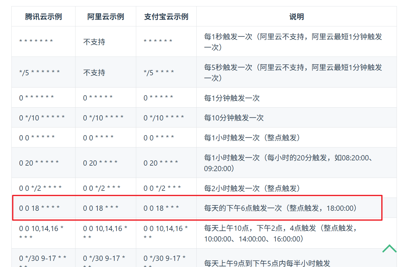 而不是文档中显示的 0 0 18 * * *(缺少最后的"年"字段)。阿里云的上传校验要求完整的 7 位 cron 表达式,缺少最后一位会导致 InvalidTimingTriggerConfig 错误。