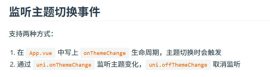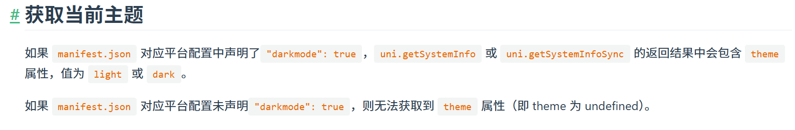 目前获取当前主题的文档(https://uniapp.dcloud.net.cn/tutorial/darkmode.html#get-theme)是这么描述的: