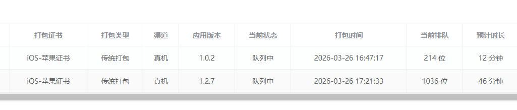 - 打包队列页面:可登录开发者中心 打包队列 页面查看排队状态