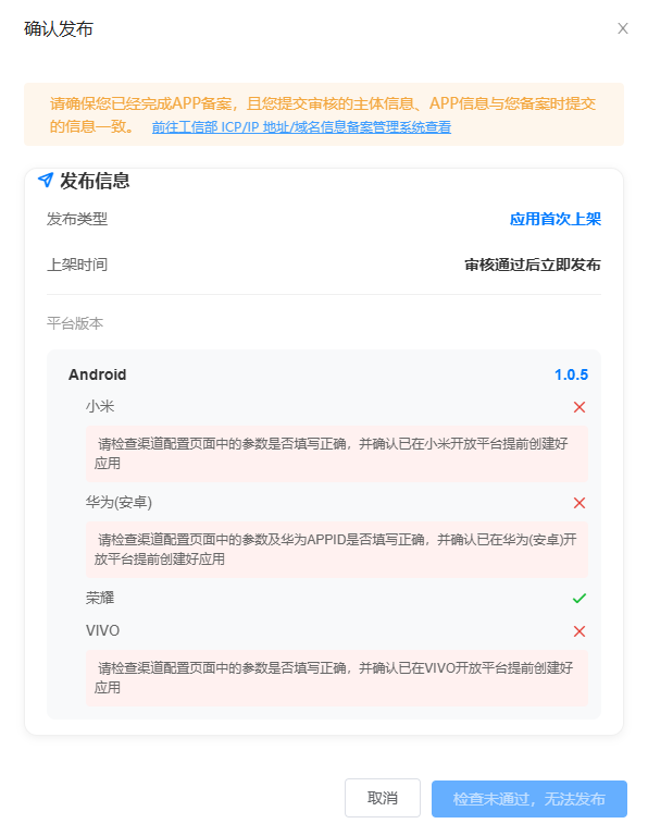 如果仅有一个平台检查通过,通常是因为其他平台的应用未完全创建成功(如华为、小米、荣耀需要手动在后台创建应用并等待审核),或参数格式不符合对应平台 API 要求。建议优先检查华为、小米、荣耀这几个必须手动创建应用的平台状态。