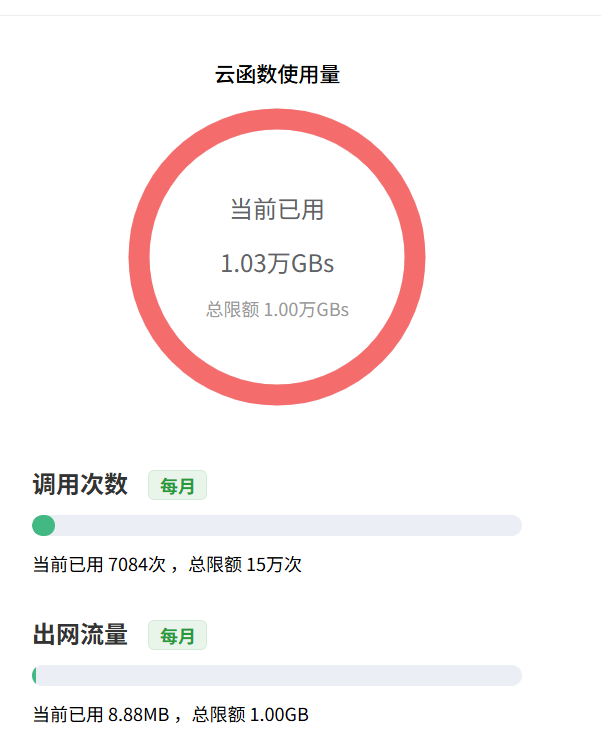 这意味着即使您的调用次数还有很多,但如果云函数在每个小时都有运行(即使单次执行时间很短、内存占用很小),也会按每小时约 90 GBs 的最低标准计费,导致资源使用量(GBs)消耗较快。