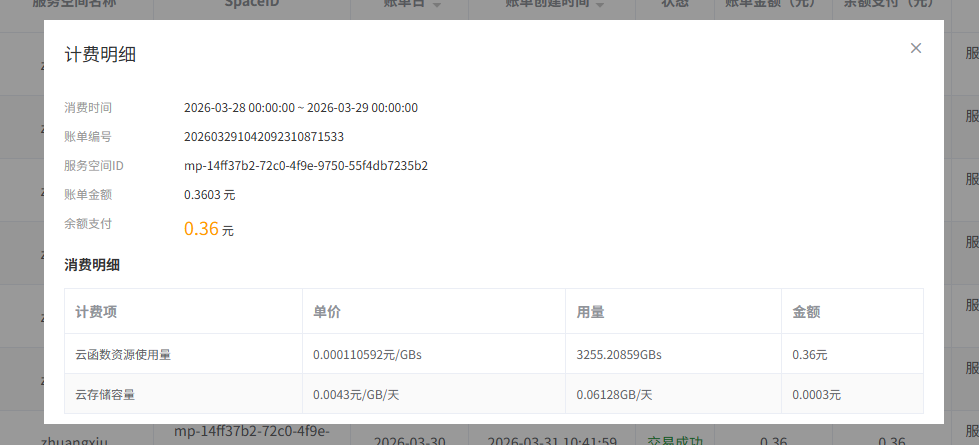 每天的云函数使用量都是 3255.20859GBs ,每天固定扣费 0.36元
