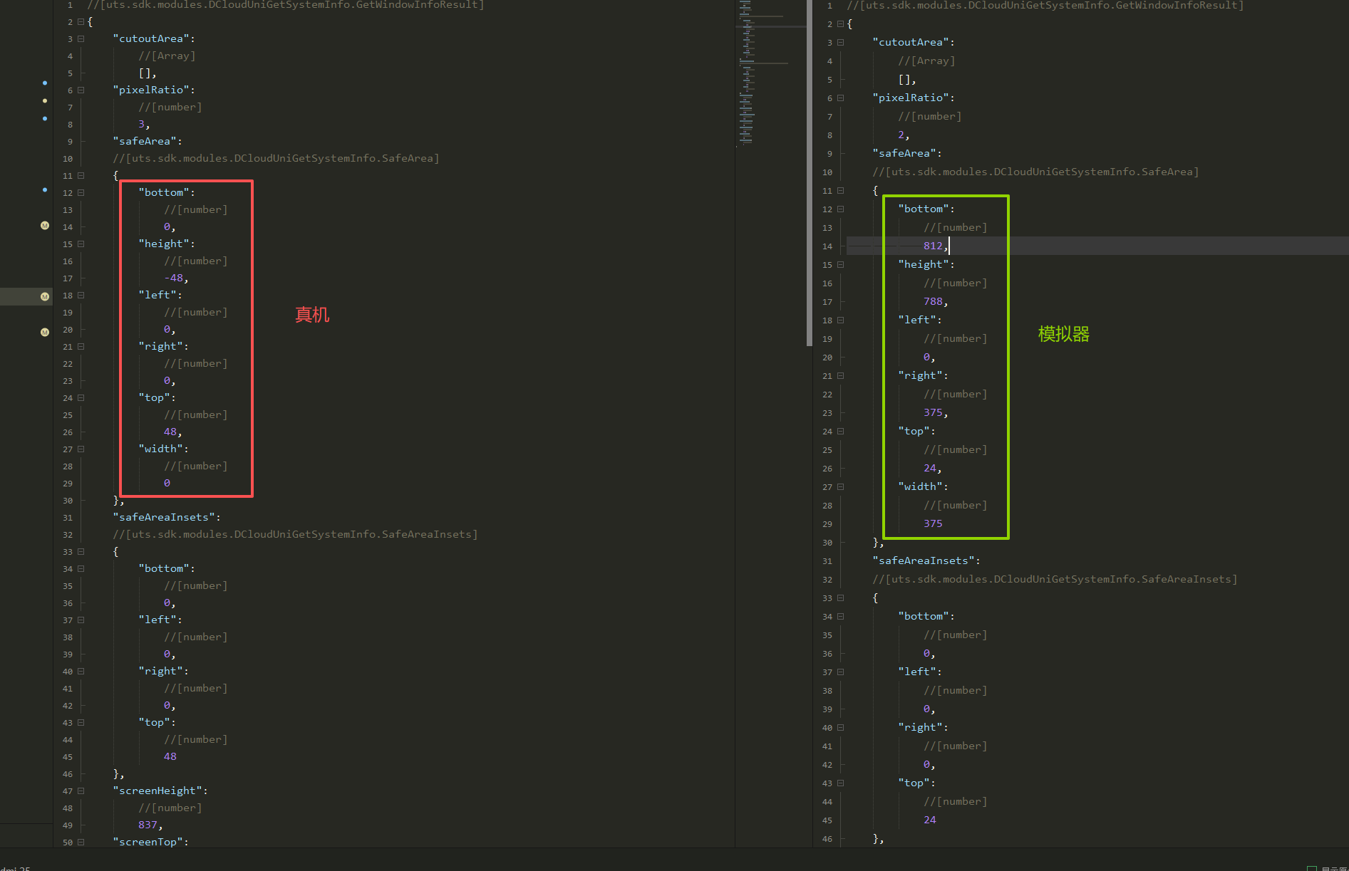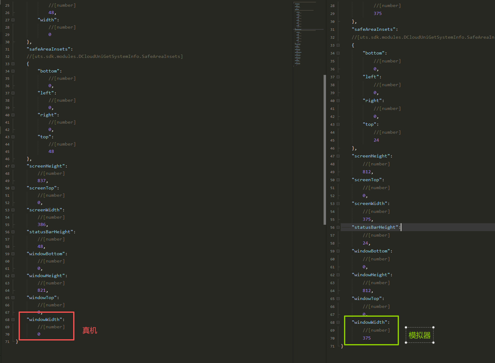console.log(JSON.stringify(uni.getWindowInfo())),将两者的完整输出贴出对比 - 具体的错误表现:是字段缺失?数值异常(如 windowWidth 为 0)?还是类型不匹配?