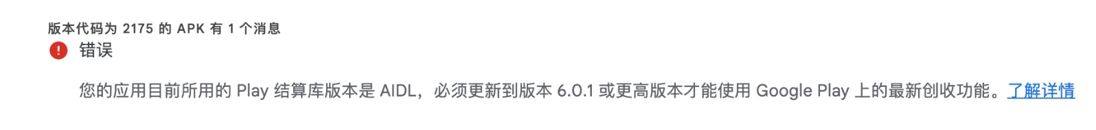 【报Bug】上传谷歌商店发布提示"您的应用目前使用的 Play 结算库版本是 AIDL,若要使用 Google Play 上的最新创收功能,必须更新到 6.0.1 或更高版本。"