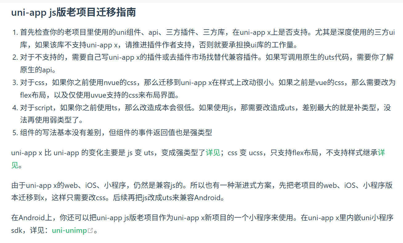 首先需要检查老项目中使用的 uni 组件、API、三方插件、三方库在 uni-app-x 上是否支持。特别是深度使用的三方 UI 库,如果该库不支持 uni-app-x,需要推进插件作者支持,否则需要承担更换 UI 库的工作量。对于不支持的组件或 API,需要自己编写 uni-app-x 的插件或去插件市场找替代兼容插件(如果编写调用原生的 uts 代码,需要了解原生 API)。