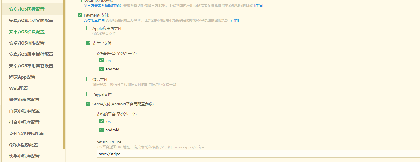 stripe支付,该配置的都添加了。但安卓就是没有支付宝选项。iOS支付选项都是全的