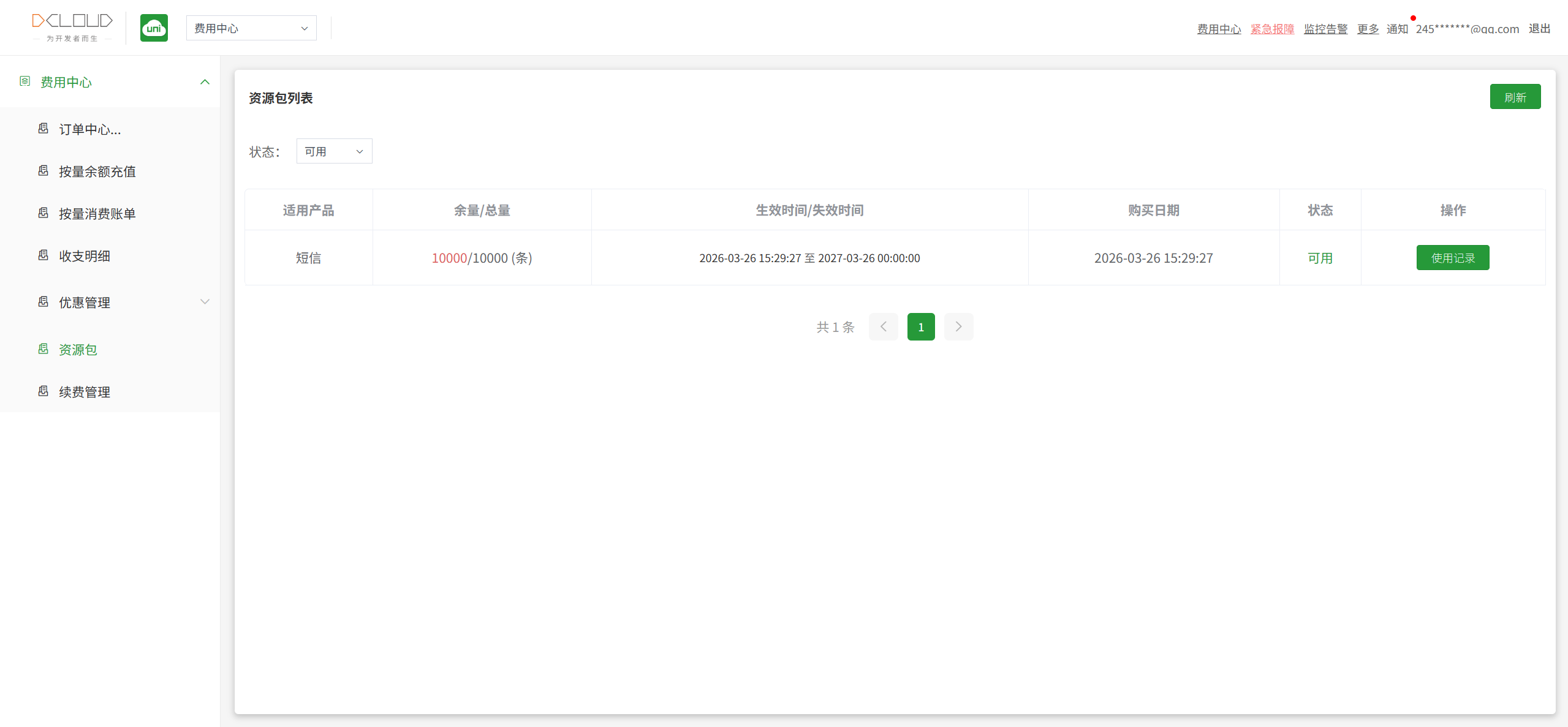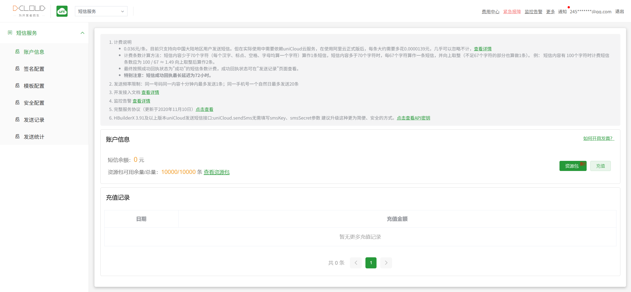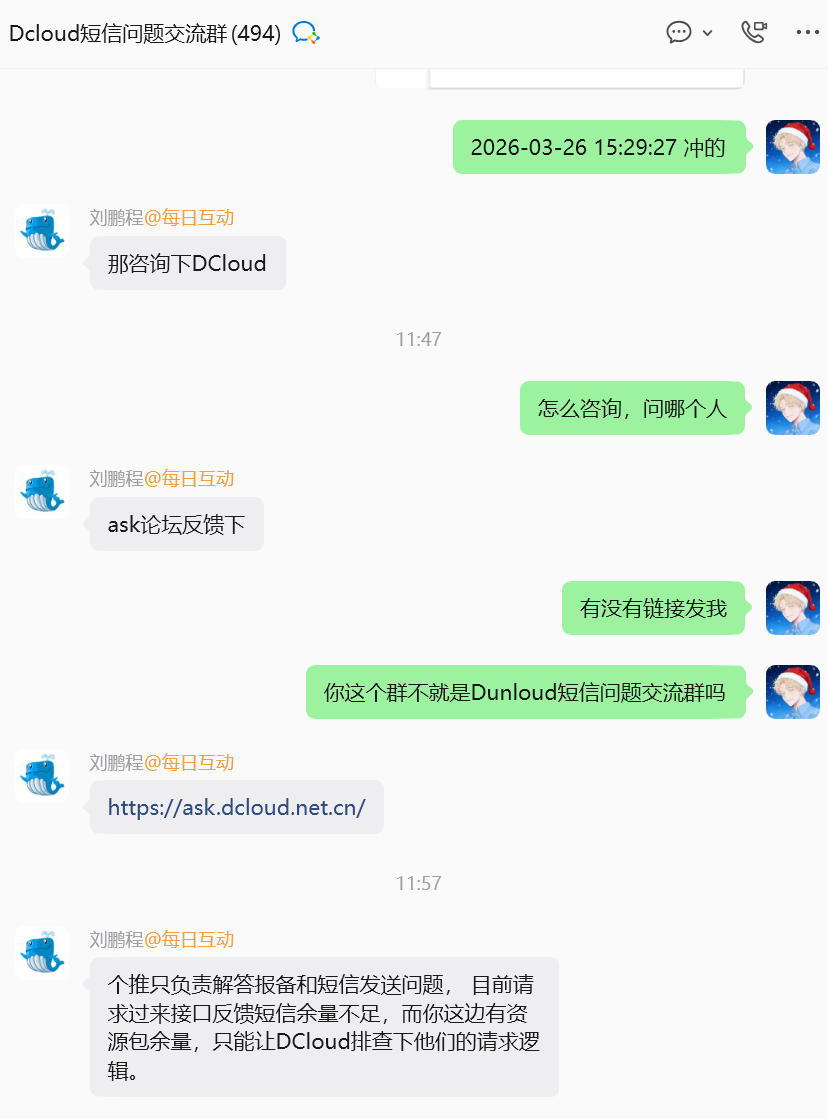 目前请求过来接口反馈短信余量不足,而这边有资源包余量,需要DCloud排查下请求逻辑。