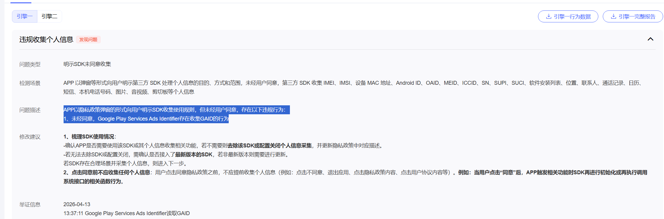 1、未经同意,Google Play Services Ads Identifier存在收集GAID的行为