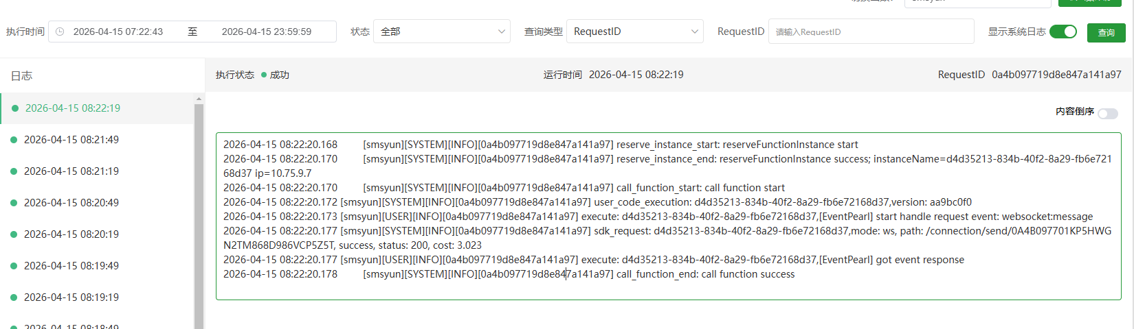 有调用便会产生一次请求日志,日志内容中的系统输出可以通过日志页面右上角的【显示系统日志】开关来关闭。