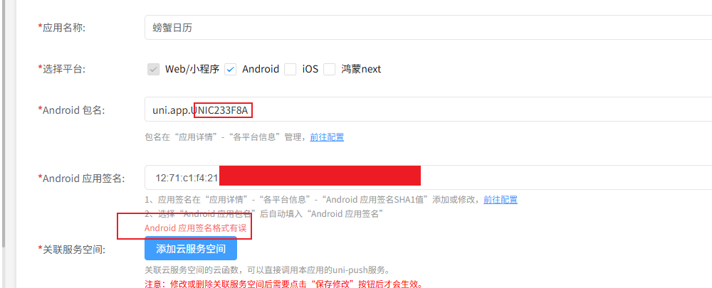在HB上申请PUSH开通时,进入开通APP开通界面,在各平台信息配置了SHA1。并成功保存。但是在当前应用开通PUSH应用时,我选择了APP包名,自动跳转出来SHA1签名,但是会提示应用签名格式有误。