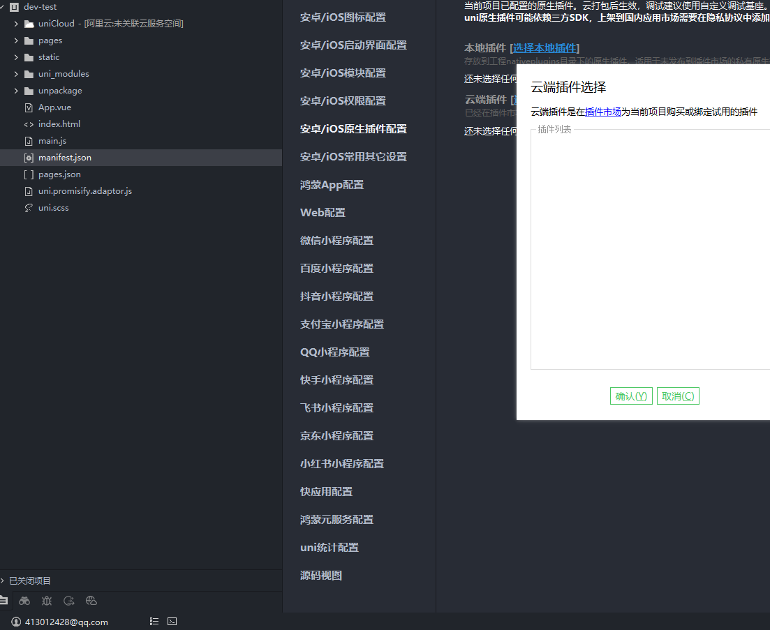 manifest.json-> App 原生插件配置 -> 云端插件 中勾选