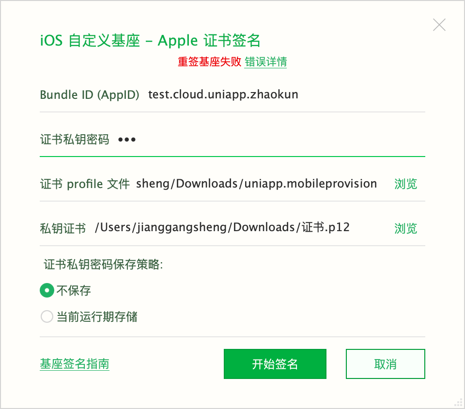如果重签失败,通常与证书配置有关。根据知识库内容,iOS标准基座需要使用开发者的证书进行签名才能运行,且HBuilderX每次升级后,由于标准基座更新,需要重新对iOS标准基座进行签名。