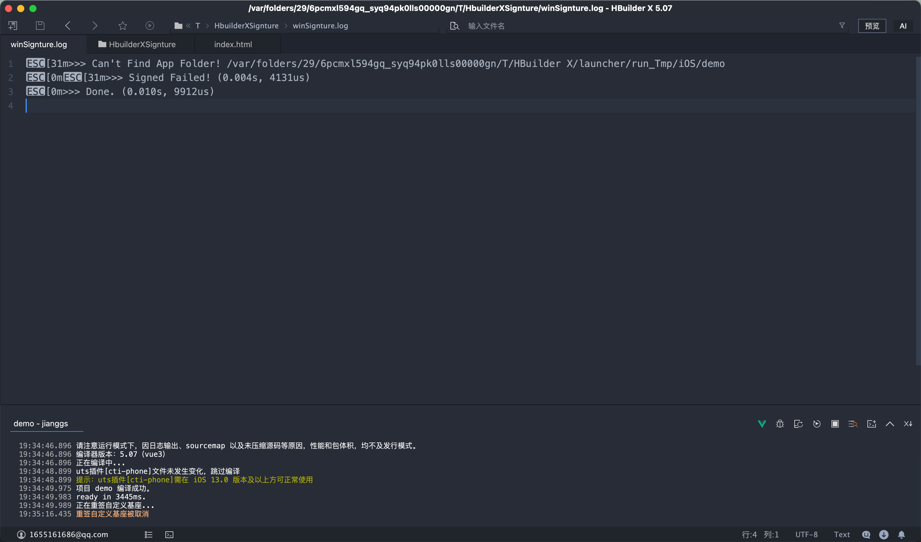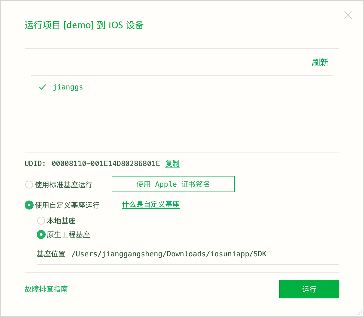 运行到ios真机 提示重签基座失败,错误详情点开时说这个应用程序找不到,路径/var/folders/29/6pcmxl594gq_syq94pk0lls00000gn/t/HBuilder X/launcher/run_Tmp/ios,这里面demo的程序是在哪一步生成的