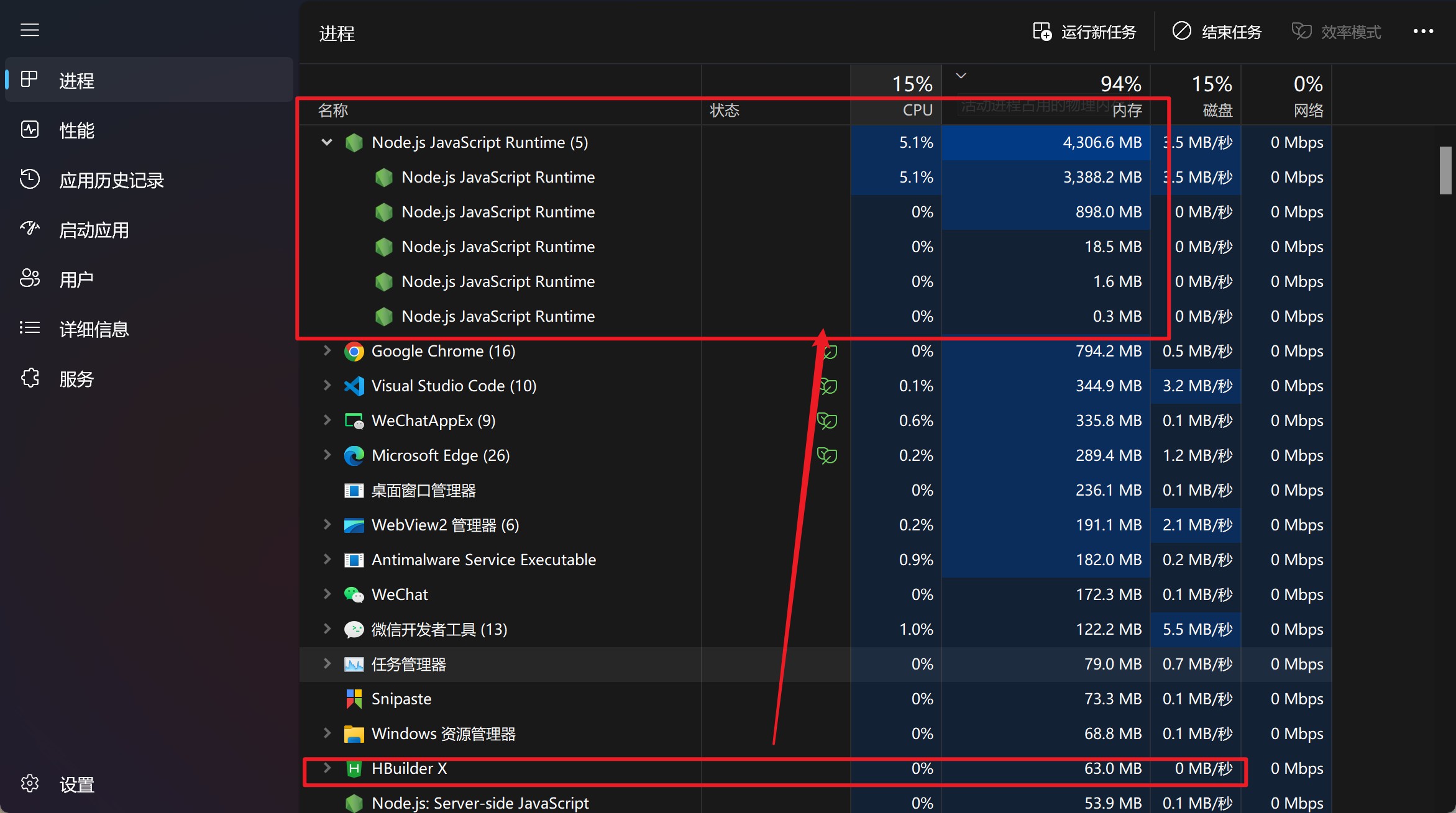 如图,上面这个node进程是和Hx关联的,关闭Hx这个进程就会自动关闭,但是不知道为什么占用内存这么高?