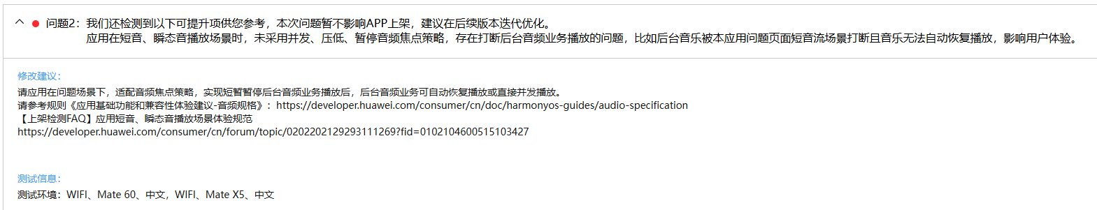 在 uni-app 鸿蒙 Next 应用中,使用 uni.createInnerAudioContext 播放短音(如点击音效)时,会打断后台正在播放的音乐,且音效播放完成后,后台音乐无法自动恢复播放,影响用户体验。当前已设置 sessionCategory: 'ambient',但问题依旧存在,需要如何优化音频并发与焦点策略?