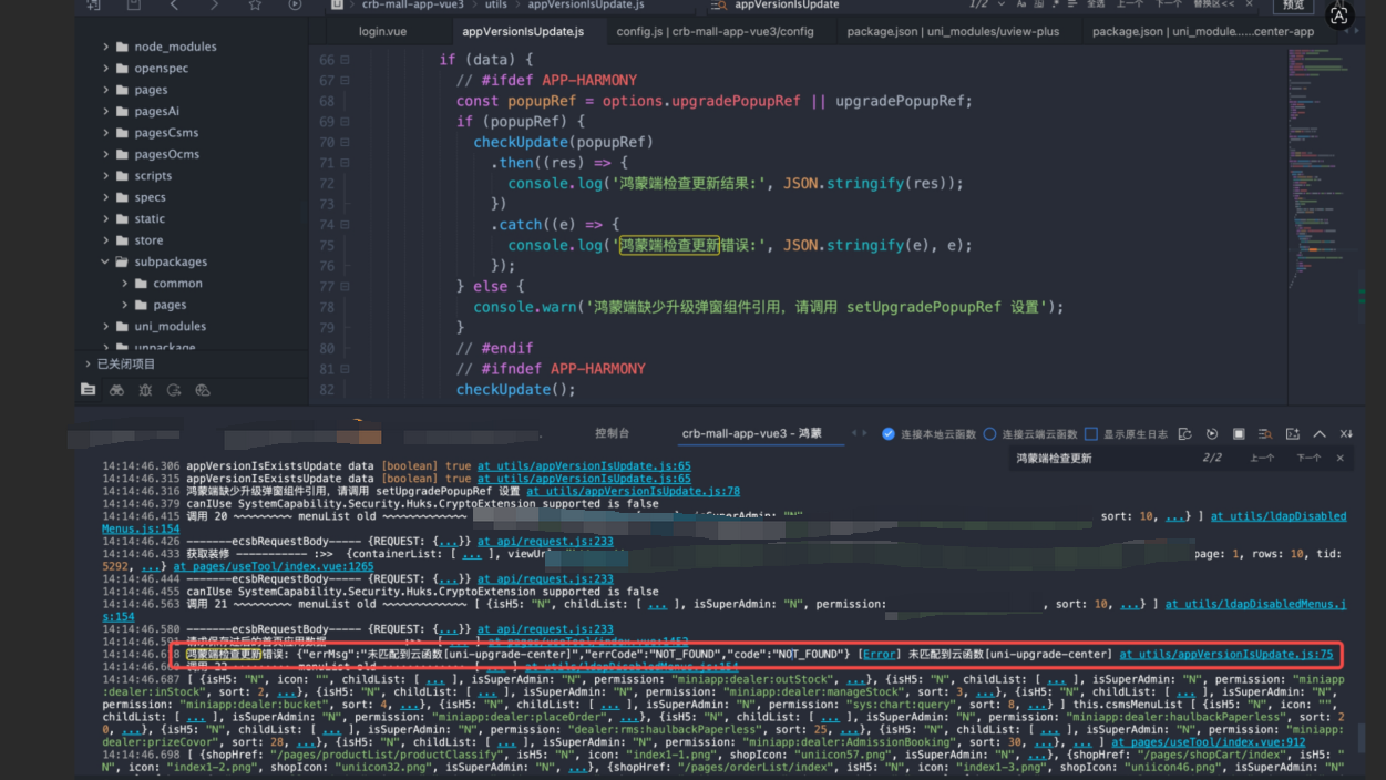 鸿蒙检查热更新checkupdate可正常调用云函数uni-upgrade-center