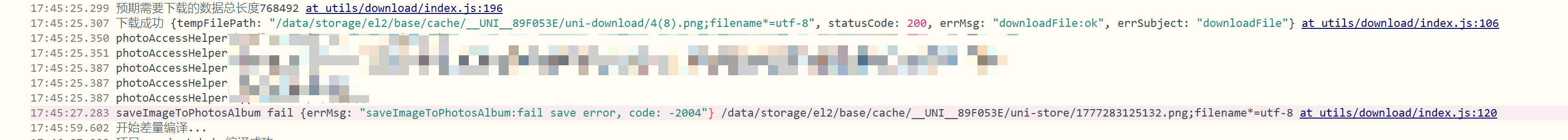 17:47:40.231 下载成功 {tempFilePath: "/data/storage/el2/base/files/apps/UNI89F053E/www/uni-download/1777283259670_5_2033365021384347648.png", statusCode: 200, errMsg: "downloadFile:ok", errSubject: "downloadFile"} at utils/download/index.js:107