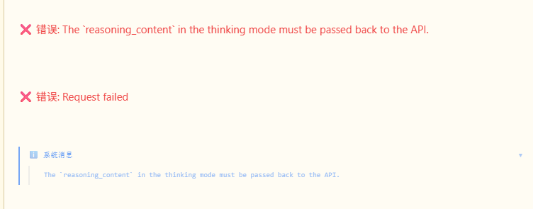 关于您遇到的错误 "The reasoning_content in the thinking mode must be passed back to the API",抱歉,我在知识库中没有找到关于该错误的具体解决方案或相关说明。