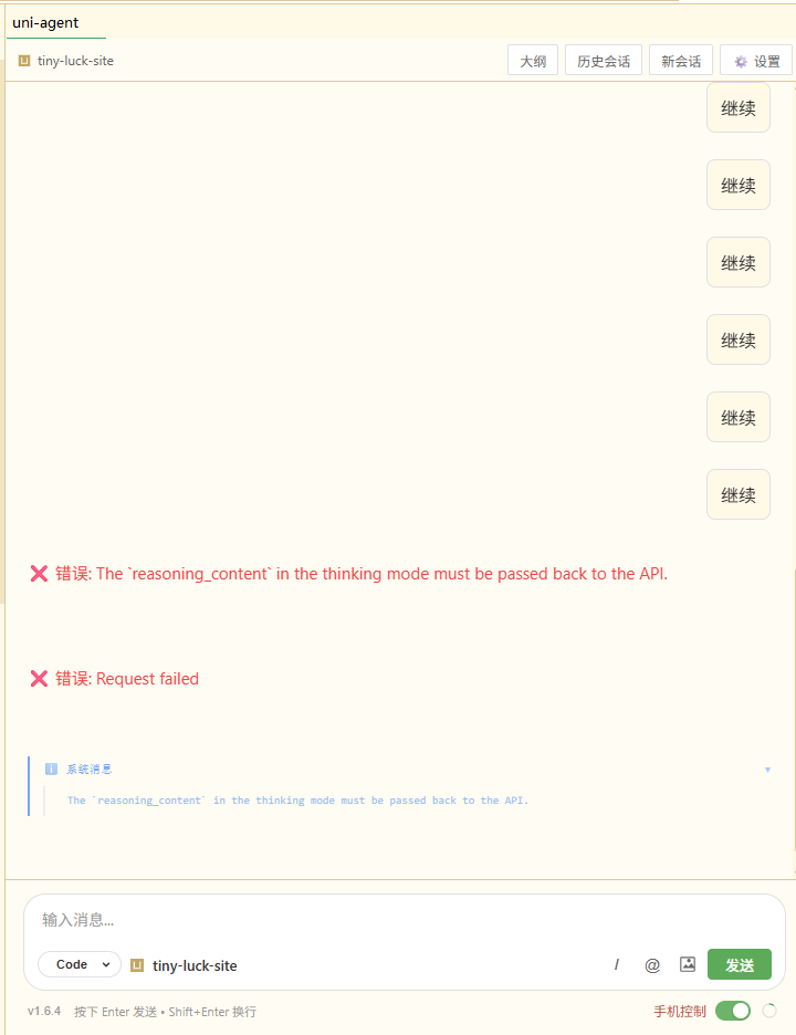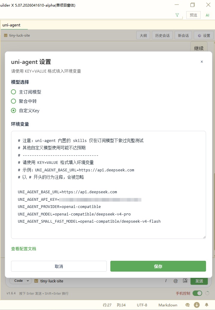 - 确认使用的 uni-agent 版本是否支持 deepseek-v4-pro 的 thinking mode(推理模式)特性