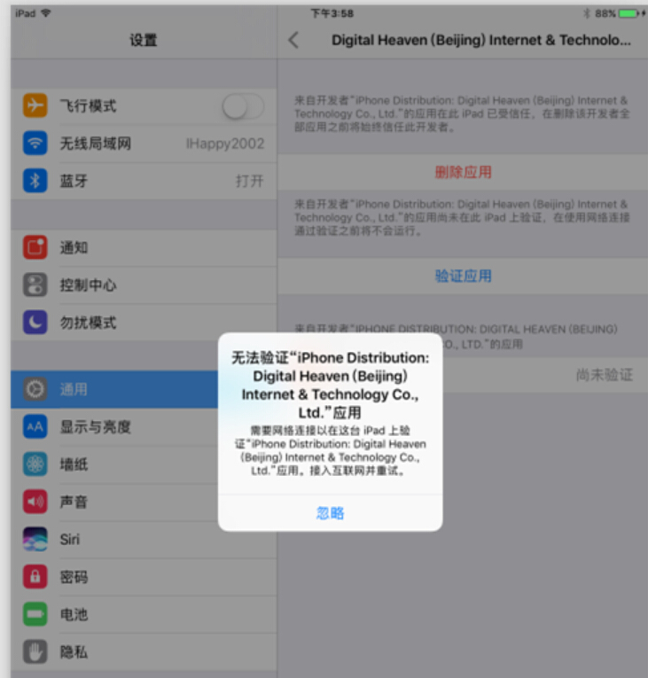 我2个IPAD真机调试一直正常,今天突然不能调试 。在同步文件到IPAD上,需要信任描述文件。但点信任时一直会验证不通过。原来都正常的。