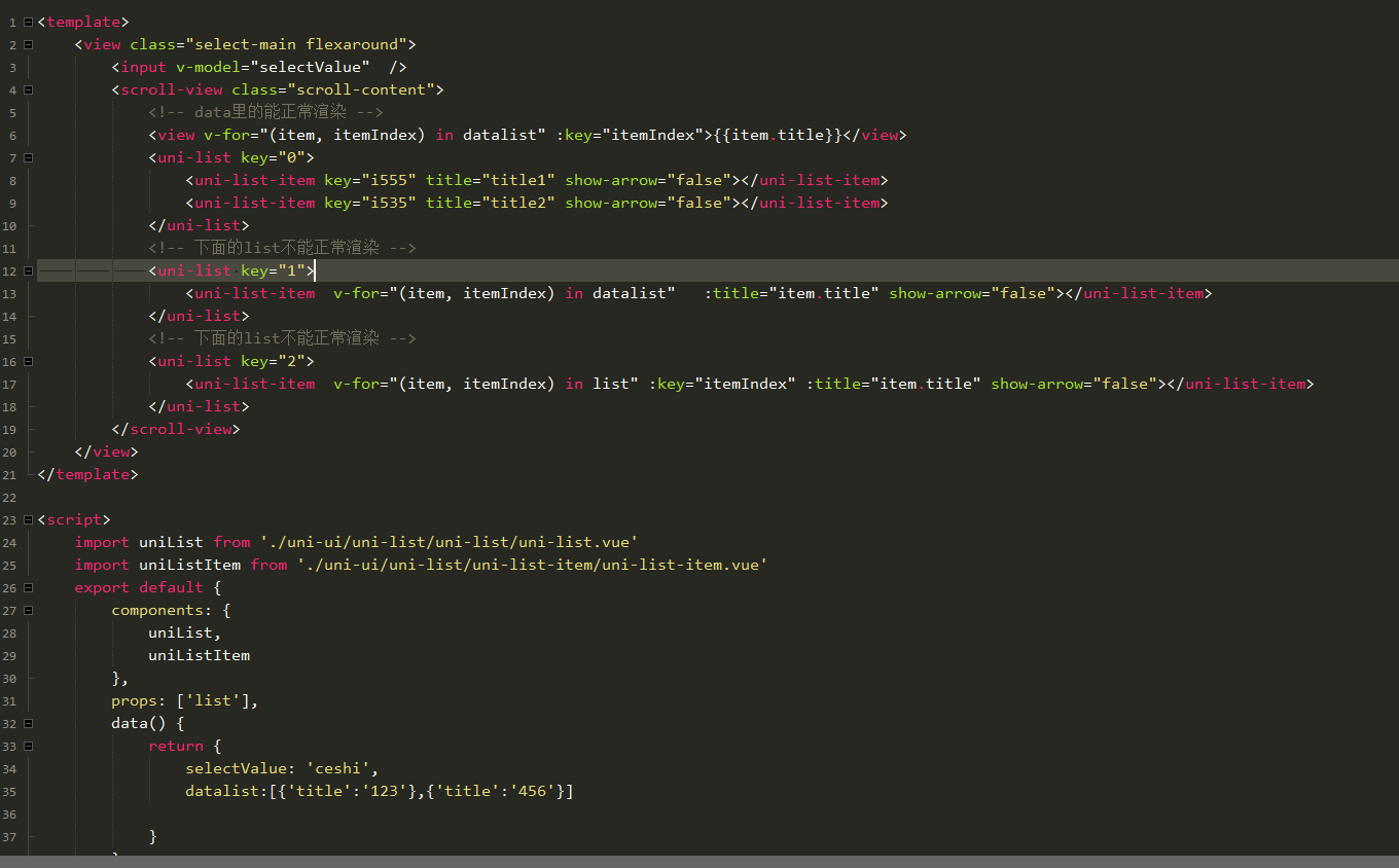 嵌套的组件中,list列表循环渲染显示不了,不同for循环的能正常显示。有附带测试代码,请大佬帮忙看下,谢谢啦