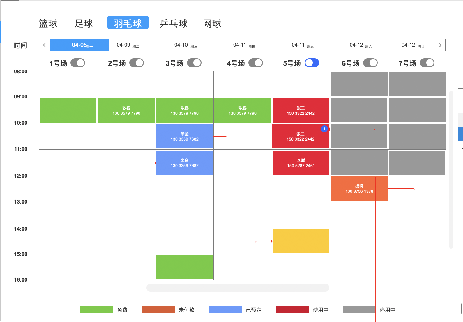 1:可以查看最近一个月的场馆预定信息,时间最好做成动态配置 2:可进行预定,并且预定成功后,当前时间点变色,不能让其他人点击