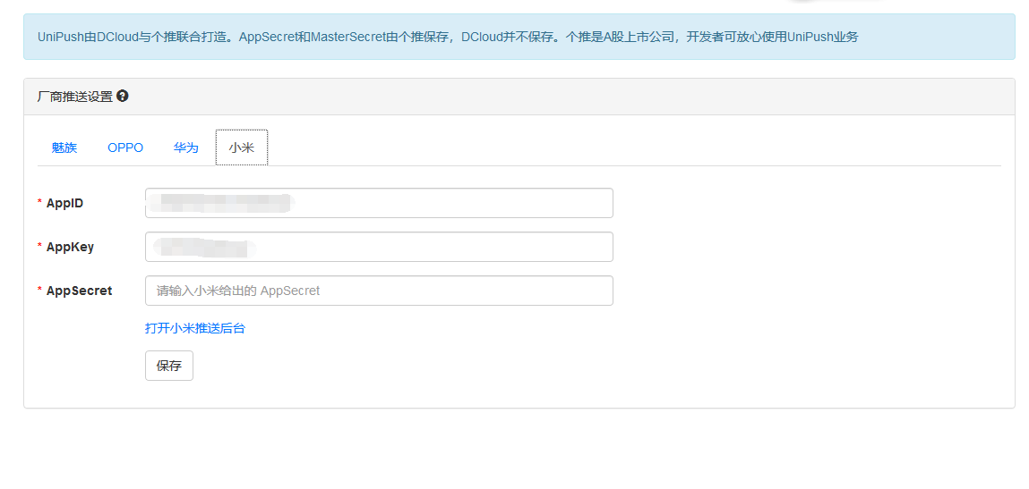 厂商通道推送中设置小米的App Secret后保存,提示保存成功,但是重新打开之后看不到保存的内容,貌似其他的厂商设置也有此类问题。