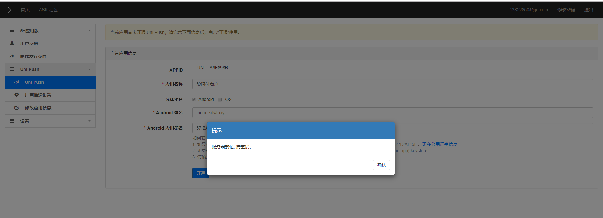 开通unipush提示:服务器繁忙,请重试。换成别的用户也会,重新退出浏览器,清楚缓存,重启电脑都无用。11月22号出现,这几天尝过过几十次都是这样。