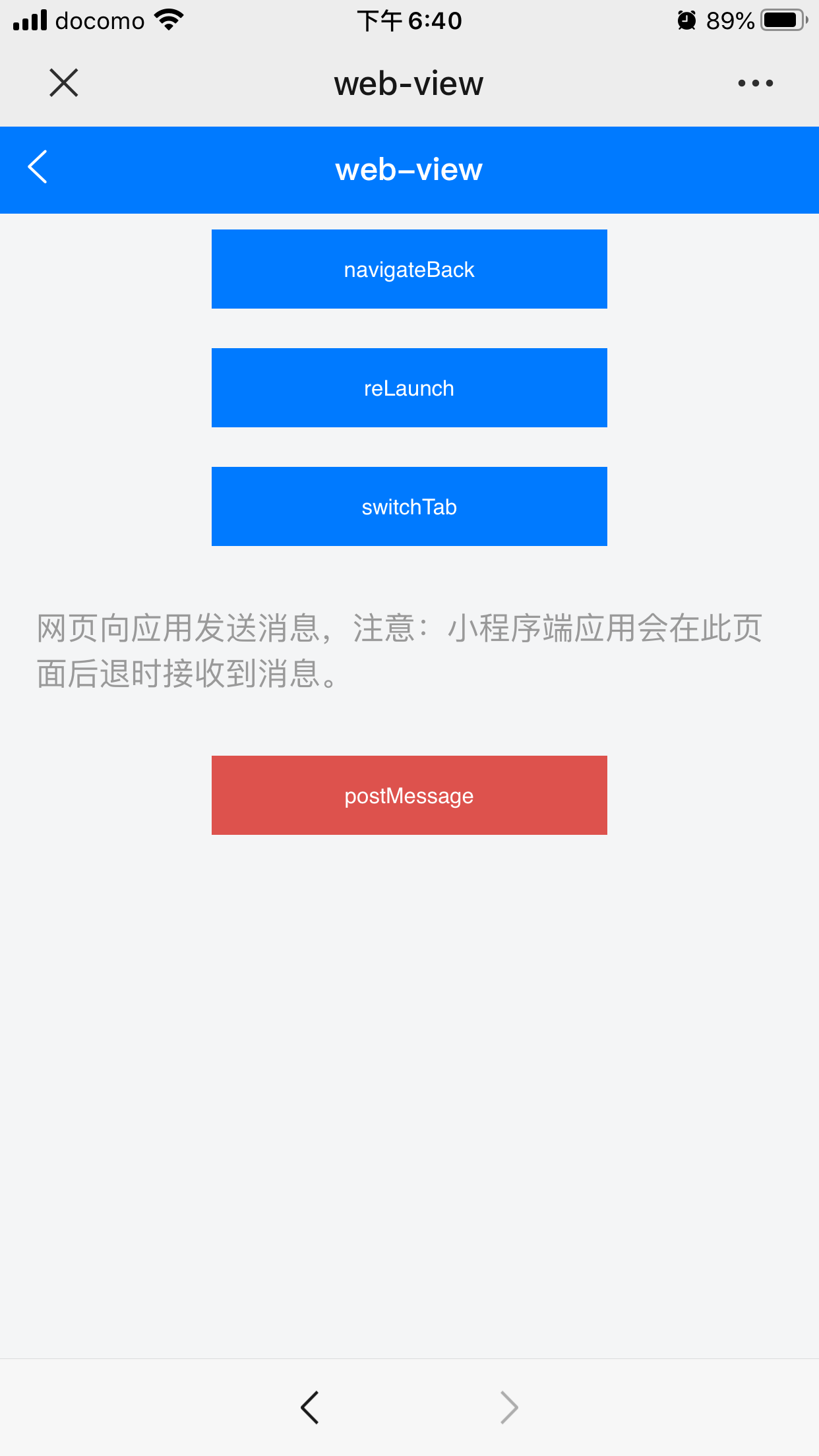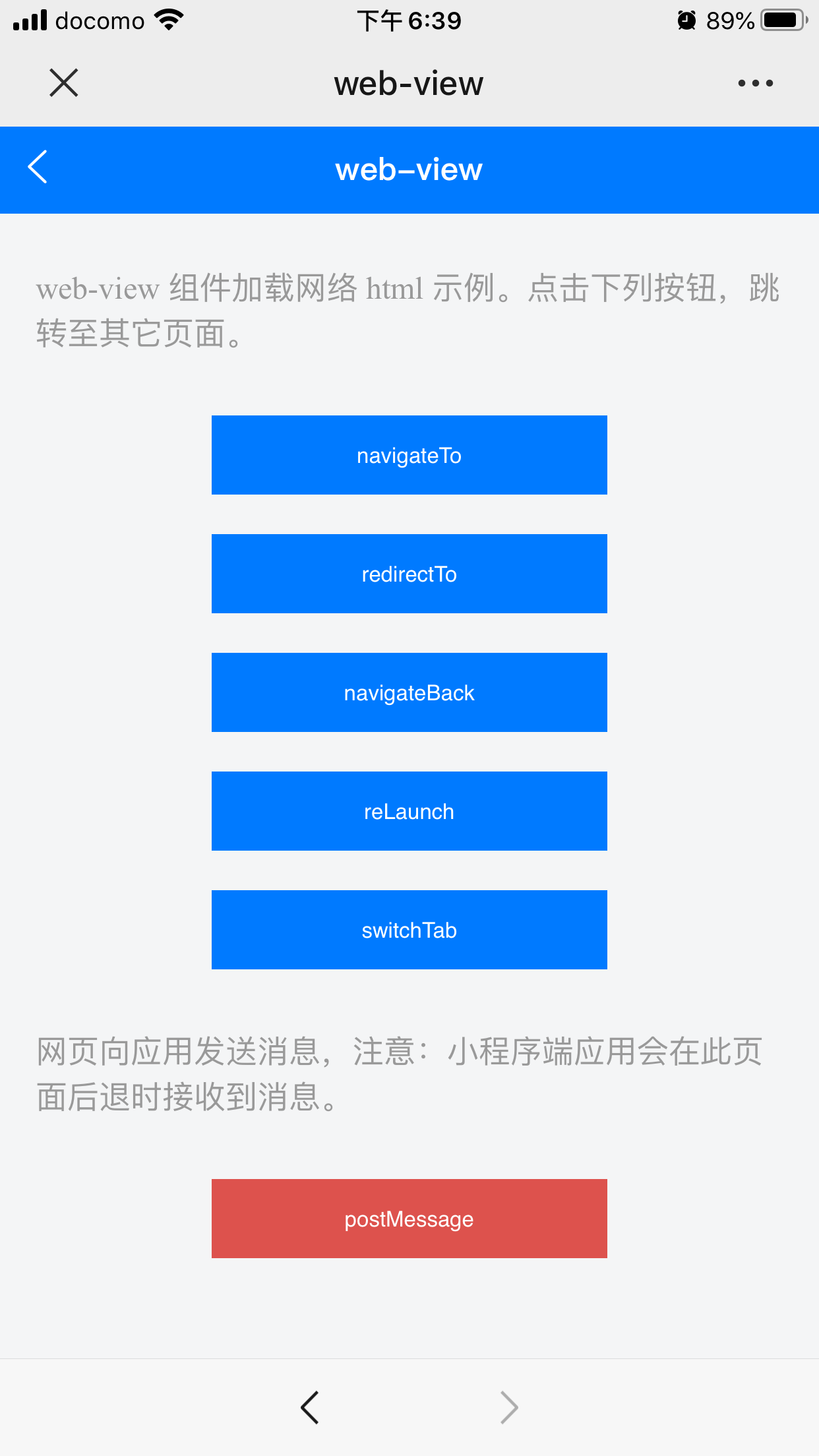3.点击会退按钮,回到内置组件画面,再次点击web-view,此时画面表示不正确。(内容表示不全,并且偏上,下拉也不好用)